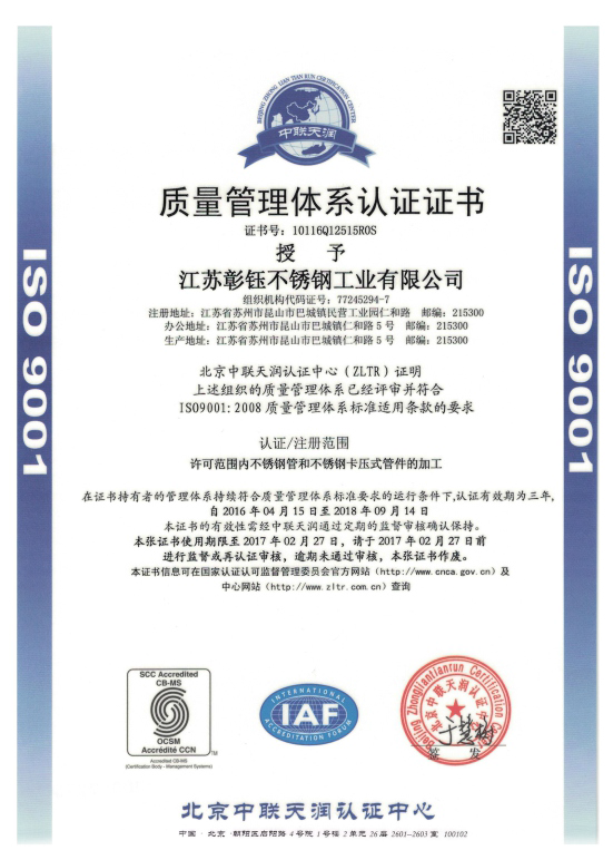 江蘇彰鈺不銹鋼工業(yè)有限公司是生產(chǎn)不銹鋼焊管、管件及其制品的專業(yè)企業(yè),公司坐落于江蘇省昆山市生態(tài)景觀的陽(yáng)澄湖旁,交通便捷。 公司擁有國(guó)內(nèi)先進(jìn)、配套齊全的高精密不銹鋼焊管生產(chǎn)線及卡壓式管件生產(chǎn)設(shè)備,并擁有萬(wàn)能力學(xué)試驗(yàn)、渦流探傷、水壓試驗(yàn)、金相分析等先進(jìn)完善的檢測(cè)設(shè)備,可提供不銹鋼焊管、內(nèi)整平管及不銹鋼卡壓式、溝槽式、焊接式管件,各項(xiàng)性能均符合GB、JlS、ASTM等國(guó)家及國(guó)際規(guī)格標(biāo)準(zhǔn),并廣泛用于汽車、自行車、醫(yī)療器械、自來(lái)水、流體輸送等行業(yè)。
